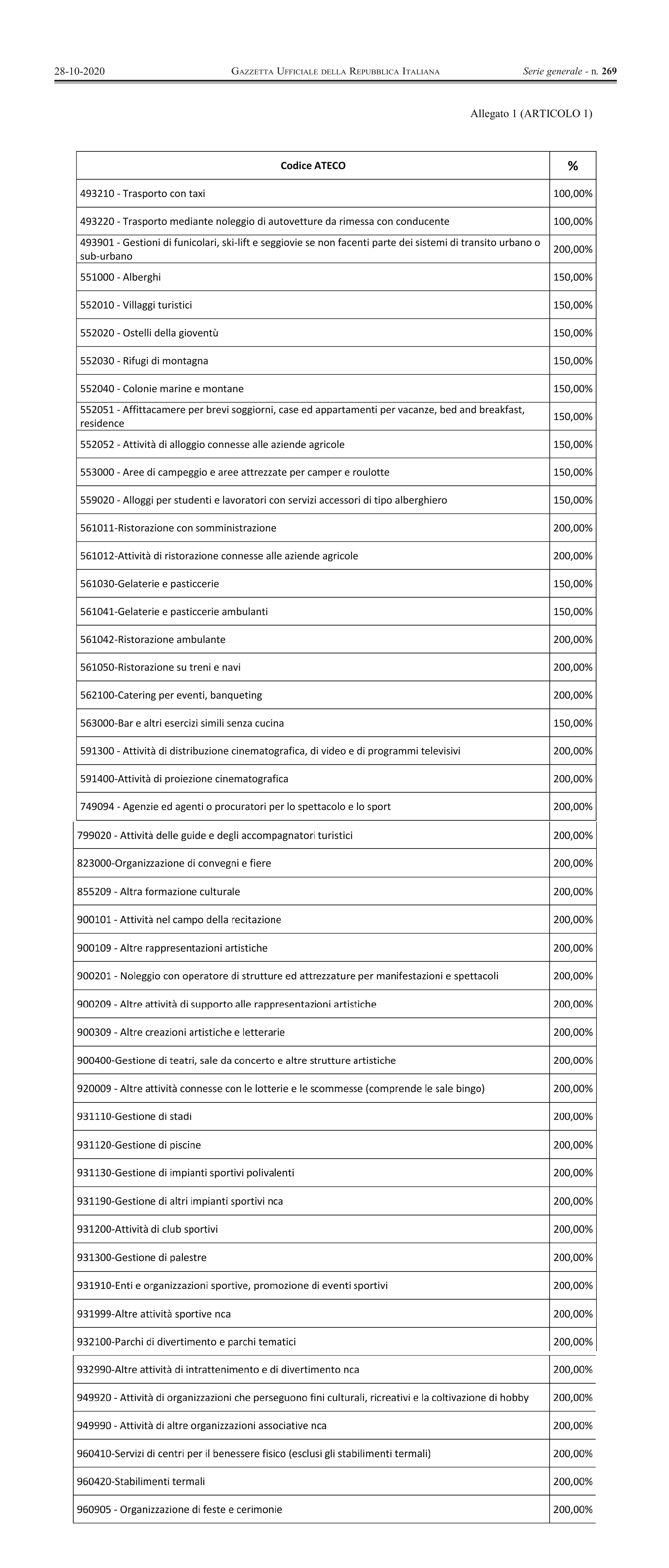 Approvato in settimana il decreto Ristori che prevede un contributo a fondo perduto per le imprese con uno dei 53 codici individuati (vedi tabella allegata): tra gli altri, ristoranti, bar, gelaterie, pasticcerie e catering, taxi e ncc, palestre ed eventi. Le imprese che avevano già presentato la domanda per il contributo previsto nel decreto Rilancio non dovranno fare alcuna richiesta e beneficeranno del nuovo ristoro attraverso l’accredito sul conto corrente, da parte dell’Agenzia delle entrate, entro il 15 novembre. Per chi farà la domanda per la prima volta (per esempio le imprese con un volume d’affari sopra i 5 milioni di euro, escluse dal precedente decreto) i tempi slitteranno al 15 dicembre e il criterio sarà lo stesso: il fatturato dell’aprile 2020 dovrà essere inferiore del 66% di quello di aprile 2019. L’importo sarà erogato sulla base del fatturato 2019 e del coefficiente attribuito alle singole categorie: si stima un contributo tra i mille e i 150 mila euro.