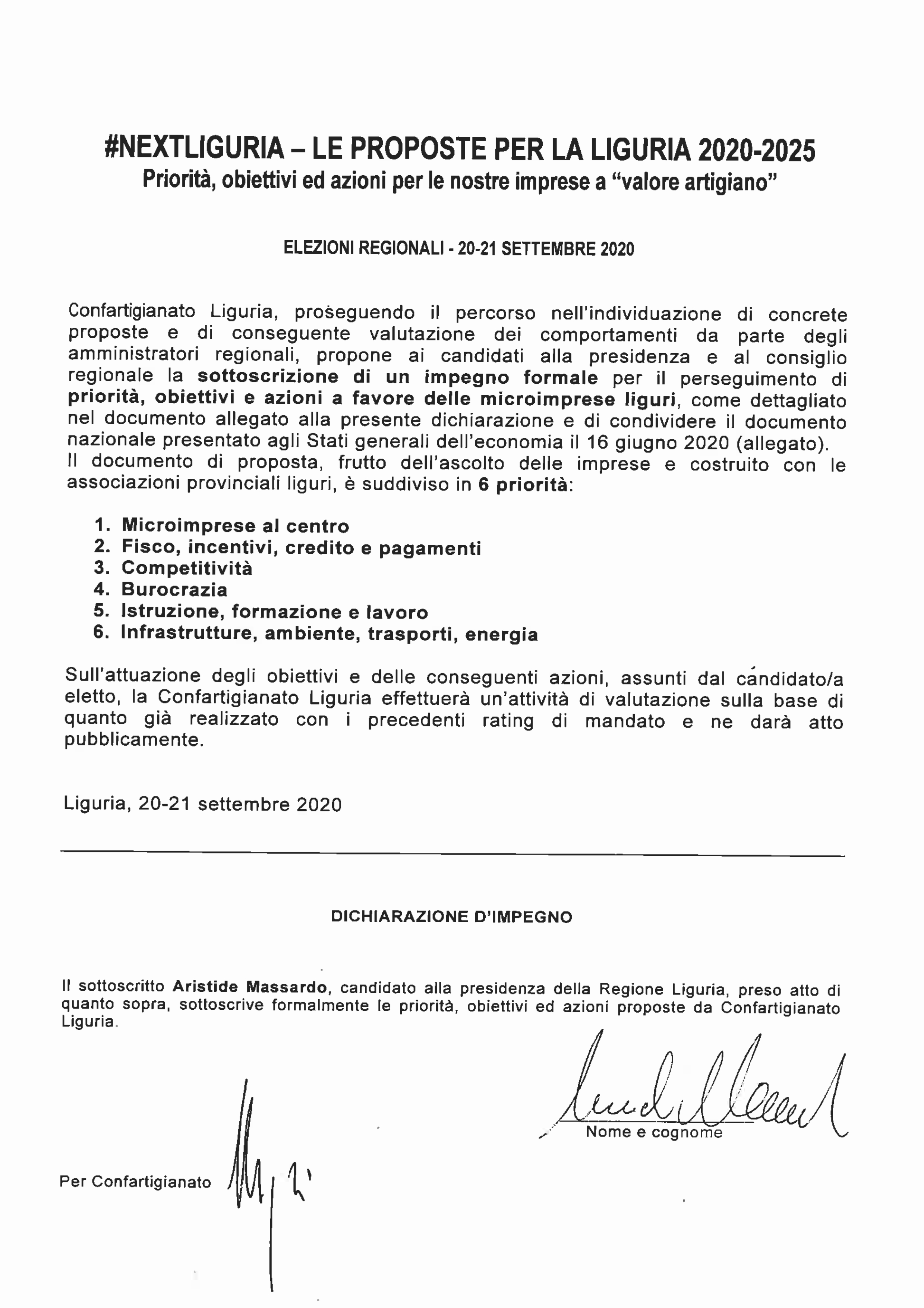 Sottoscrivendo il documento, il candidato alle prossime elezioni regionali si è impegnato a lavorare per raggiungere una serie di obiettivi riguardanti sei temi fondamentali per lo sviluppo della “Liguria di domani”: microimprese al centro; fisco, incentivi, credito e pagamenti; competitività; burocrazia; formazione e lavoro; infrastrutture, ambiente, trasporti ed energia.