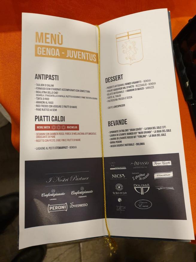 Giocavano in casa, nelle sale riservate alla corporate hospitality del Ferraris, le degustazioni di olive e pesto di Olio Anfosso di Chiusavecchia (Im), le lasagne al pesto di Stemarpast di Genova, i variegati cioccolatini di Romeo Viganotti di Genova, il gelato crema all'uovo e limone e basilico di I Giardini di Marzo di Varazze (Sv), preparati e offerti con una macchina dell'Ottocento, lo yogurt del Caseificio Val D’Aveto di Rezzoaglio (Ge), le torte con i simboli delle sue squadre di Enea Pasticceria di Genova, il tutto abbinato a una scelta di vini e spumante della Baia del Sole della Spezia.