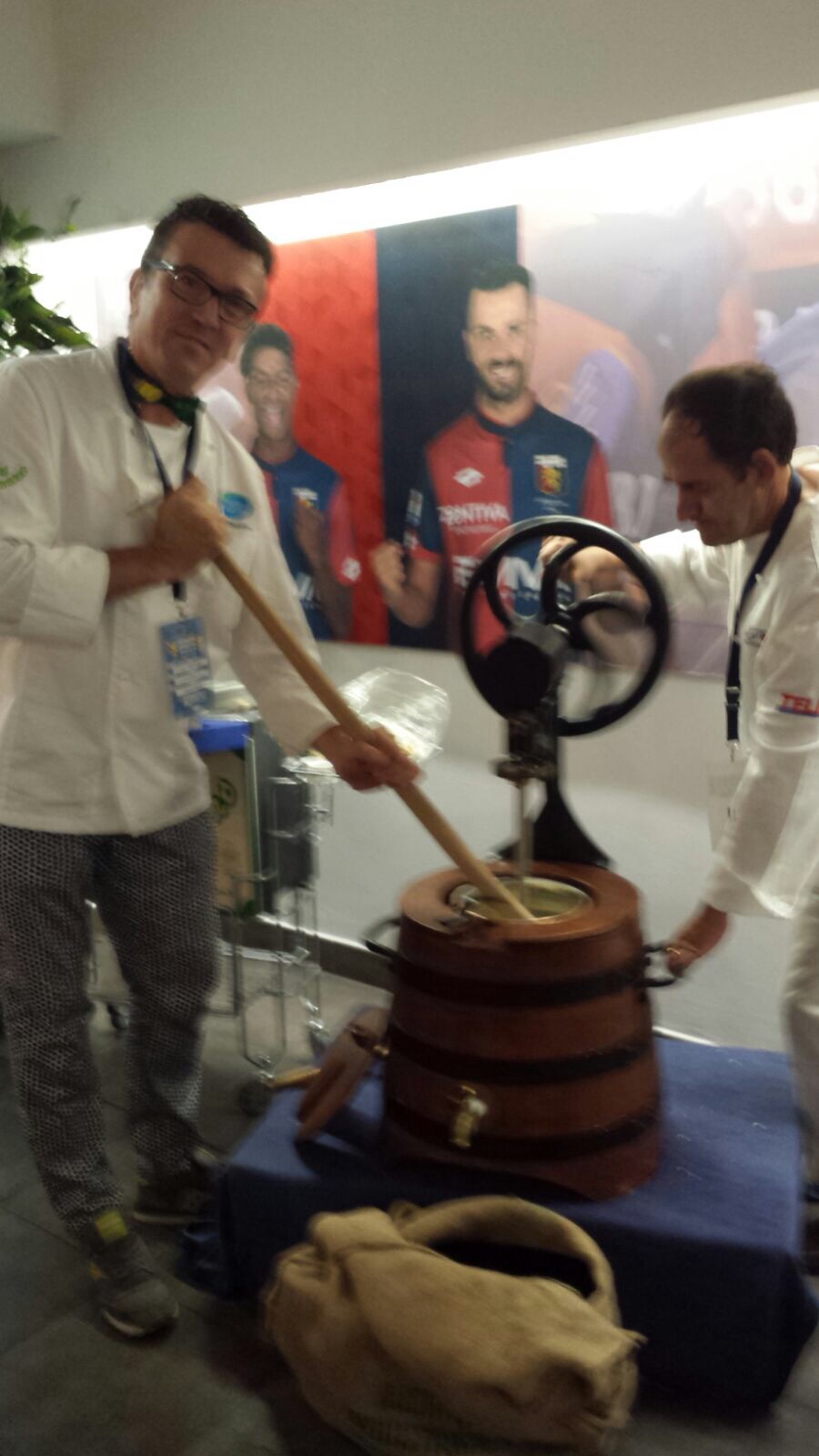 Quattro le “punte” che Confartigianato Liguria ha “schierato” nelle aree Hospitality dello stadio, in un primo appuntamento tra calcio e gusto che ha visto, tra i protagonisti, la birra, l’olio e il gelato. Il Birrificio di Savona ha proposto su ogni tavolo della corporate hospitality una serie di birre di produzione artigianale. Olio Anfosso di Chiusavecchia (provincia di Imperia) ha invece preparato degustazioni di olio extra vergine di oliva, olive e pasta di olive nere taggiasche, oltre all’immancabile pesto. Presenti anche Eugenio e Pier Giorgio Boccardo dell’azienda genovese Romeo Viganotti, specializzata nella produzione di cioccolato con macchinari dell’Ottocento e, recentemente, anche di gelato, proposto in un originale carrettino d’epoca: tra gli altri gusti, le specialità tiramisù con grano saraceno, cioccolato primitivo e il dissetante ananas e zenzero. Non poteva mancare il sorbetto “Limone e basilico”, campione d’Italia nel 2014 e vicecampione d’Europa nel 2015, una creazione del maestro artigiano Marco Venturino dei “Giardini di Marzo” di Varazze (Savona), protagonista, tra l’altro, di uno “showcooking” permanente: in una macchina originale del 1870 ha realizzato una crema all’uovo con gli ingredienti della ricetta tradizionale. Queste ultime due imprese godono anche del prestigioso marchio della Regione Liguria “Artigiani In Liguria”, sinonimo di controllo e qualità.